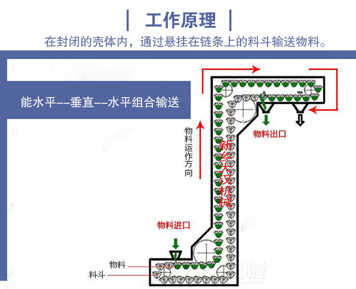 Z型轉斗式提升機是在封閉的殼體內,通過懸掛在鏈條上的料斗輸送物料。能水平--垂直--水平組合輸送。可以單點或多點加料,通過卸料裝置完成單點或多點卸料。全封閉、無泄露、無污染。本設備較大優點是組成形式靈活,對物料的破損率低,可杜絕不良品的產生,適合各種需要柔和處理物料的場合。如:谷物類塑料類菜籽類螺絲帽等。